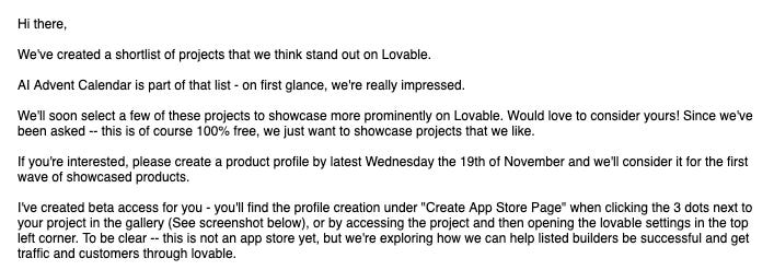 Another moment that hit me was the email from Lovable after I submitted the project to their contest. It sparked so much interest, and they highlighted the creativity behind the project. That external validation, from a platform I was literally using to build the thing, was surreal.