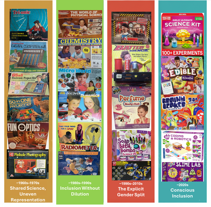 I sorted these images decade by decade, and what emerged (see Figure 2) was not the familiar, linear story of progress we often assume, but a pattern; one that helps explain why we are still campaigning about gender inclusion in STEM toys.